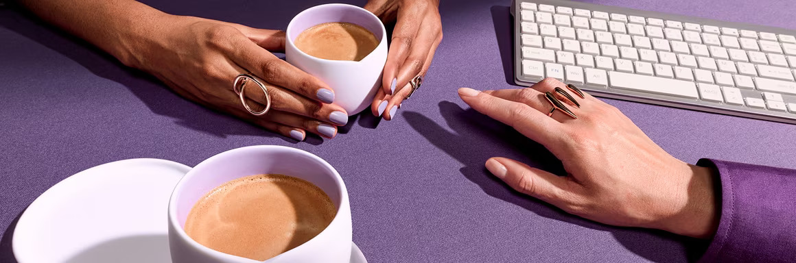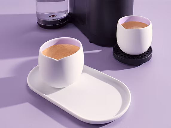 Обгръщайки напитката ти в собствена защитна обвивка, всяка чаша е изработена от двойностенен порцелан. Създадена от India Mahdavi, формата ѝ е вдъхновена от кафеното зърно, с матово бяло външно покритие и лакиран вътрешен слой в лавандулов цвят. За кафе моменти, които те връщат назад във времето.