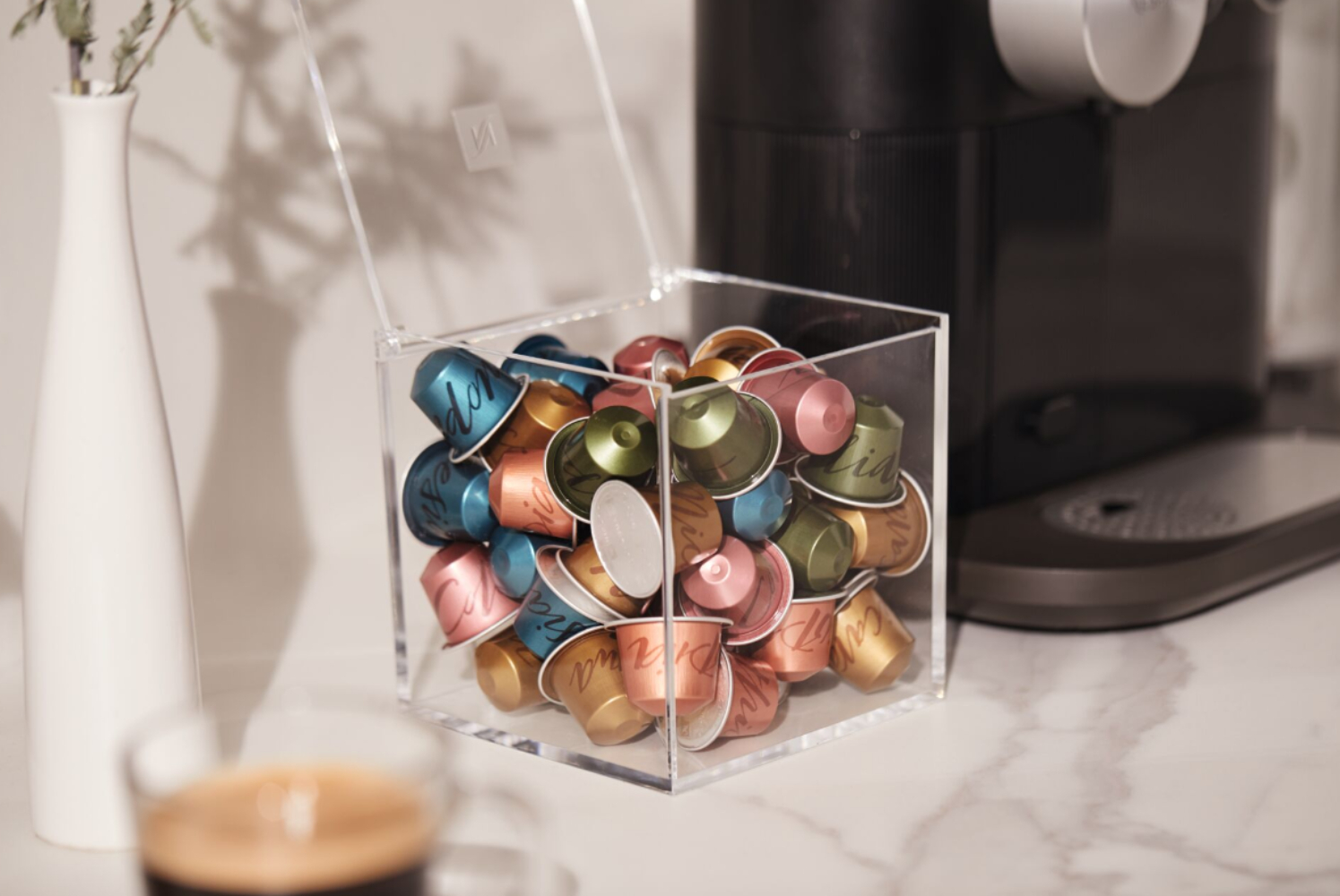 Прозрачен диспенсър с форма на куб от Plexiglas® с капацитет до 50 капсули (предлага се без капсули). Този полезен аксесоар представлява елегантно решение за съхранение на вашите Nespresso капсули с формата на куб и е изработен от прозрачен Plexiglas®, който допълва елегантния стил на всяка кухня.