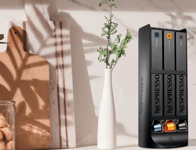 Otkrijte novi TOUCH Sleeve dispenzer. Kompaktan i praktičan dispenzer za izlaganje 6 Nespresso pakovanja kapsula zahvaljujući sistemu koji se rotira za 360° kako bi Vaše kapsule bile na dohvat ruke.