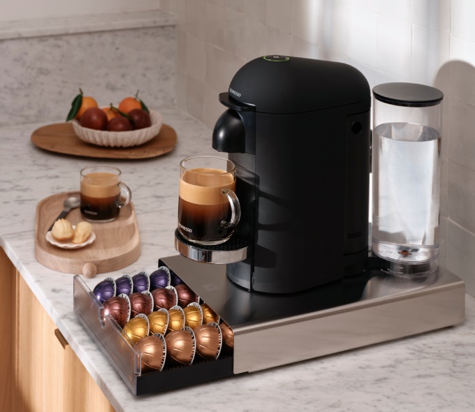 С такъв държач за капсули създаването на хармоничен кафе ъгъл е изключително просто. Ако искате да организирате капсулите си подредено или просто да ги съхранявате на едно място, този чекмедже е идеално за вас. Дизайнерът Константин Грчич е проектирал държач за капсули с полупрозрачен преден панел, който е идеален, тъй като можете да контролирате броя на кафето. С елегантния си дизайн и здравата стоманена външност, той се побира точно под вашата Nespresso машина, за да оптимизира кухненското пространство и да направи моментите на наслаждение на кафето по-красиви.