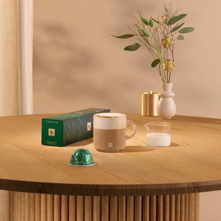 Кафе с вкус на мента с очарователни бонбонено-сладки нотки, напомнящи за празнични бонбони.