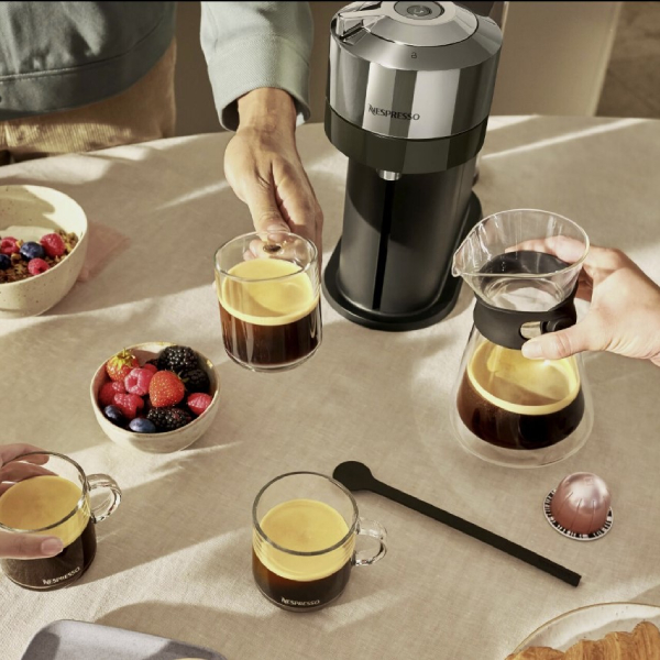 "Машината Nespresso Vertuo Next винаги е една крачка напред. Ако пиете по-дълги чаши кафе сутрин, еспресо след обяд и Gran Lungo следобед, Vertuo Next е правилният избор за вас. За да можете сами да решите колко дълго кафе изживяване искате, тази машина ви позволява да приготвяте цял набор от различни стилове кафе в пет размера кафе капсули и чаши с натискането на един бутон. Vertuo Next предлага изживяване с кафе Nespresso, крачка напред, с нова система за приготвяне: технологията Centrifusion. Позволява на машината да чете баркода, вграден във всяка капсула. Следва завъртане, като регулира дори най-малките настройки, за да извлече скритото съкровище на всяка капсула. Обръща специално внимание на всяка смес. За да докажем, че Vertuo Next ще се опита да отговори на всички ваши нужди, тя се предлага в широк избор от цветове. Със своите хромирани детайли тя със сигурност ще пасне на всяка кухня. И за да защити планетата, тя е направена от 54% рециклирана пластмаса, първата в света на Nespresso. Пренася насладата от кафе изживяването днес на друго ниво."