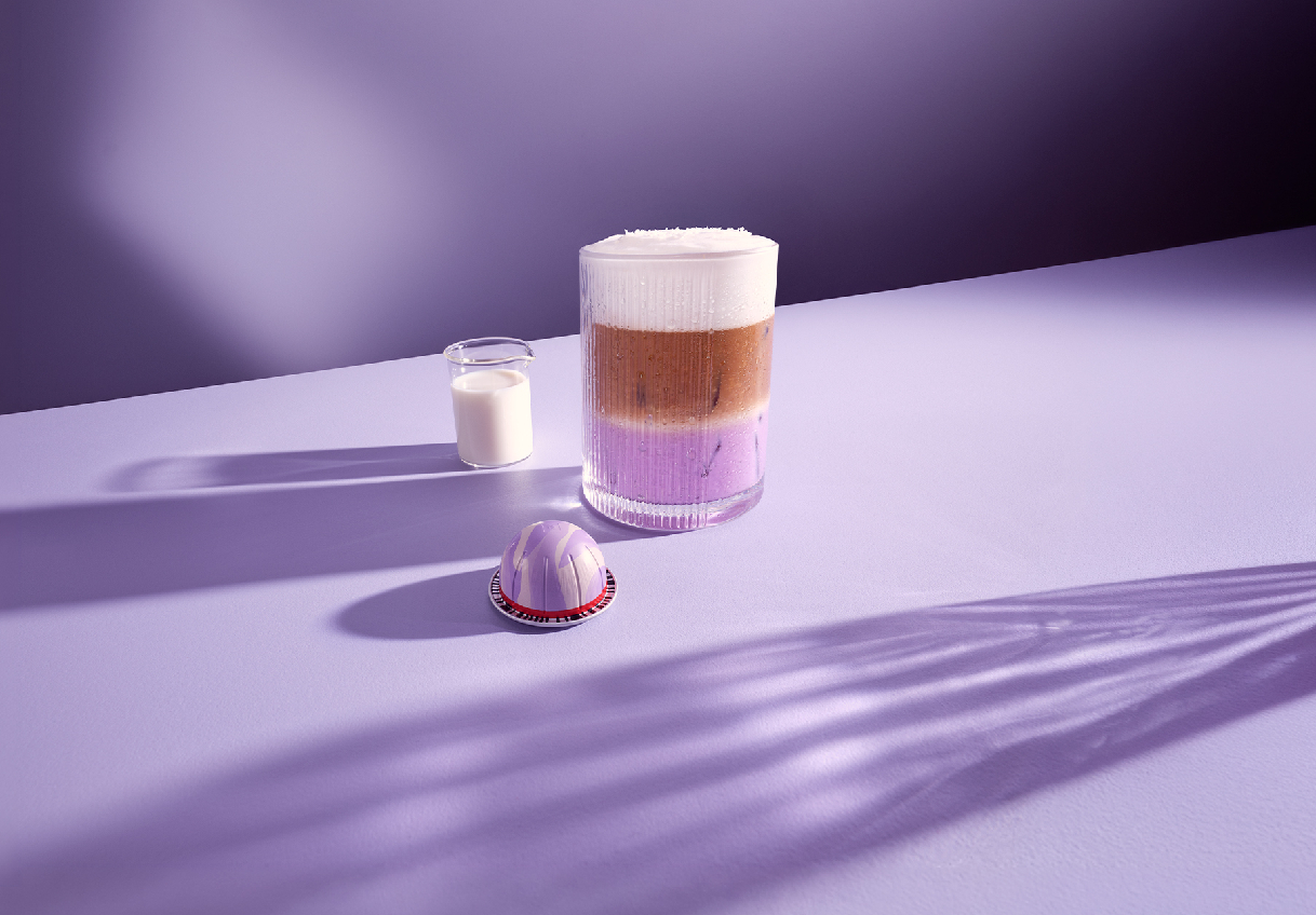 - В голяма чаша добави 6 Nespresso ледени кубчета (по 30 г), 15 мл кокосов или ванилов сироп и 70 мл ube мляко.